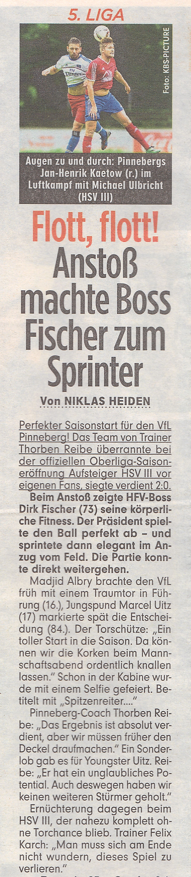 31.07.2017 (Artikel – Print): Flott, flott! Anstoß machte Boss Fischer zum Sprinter