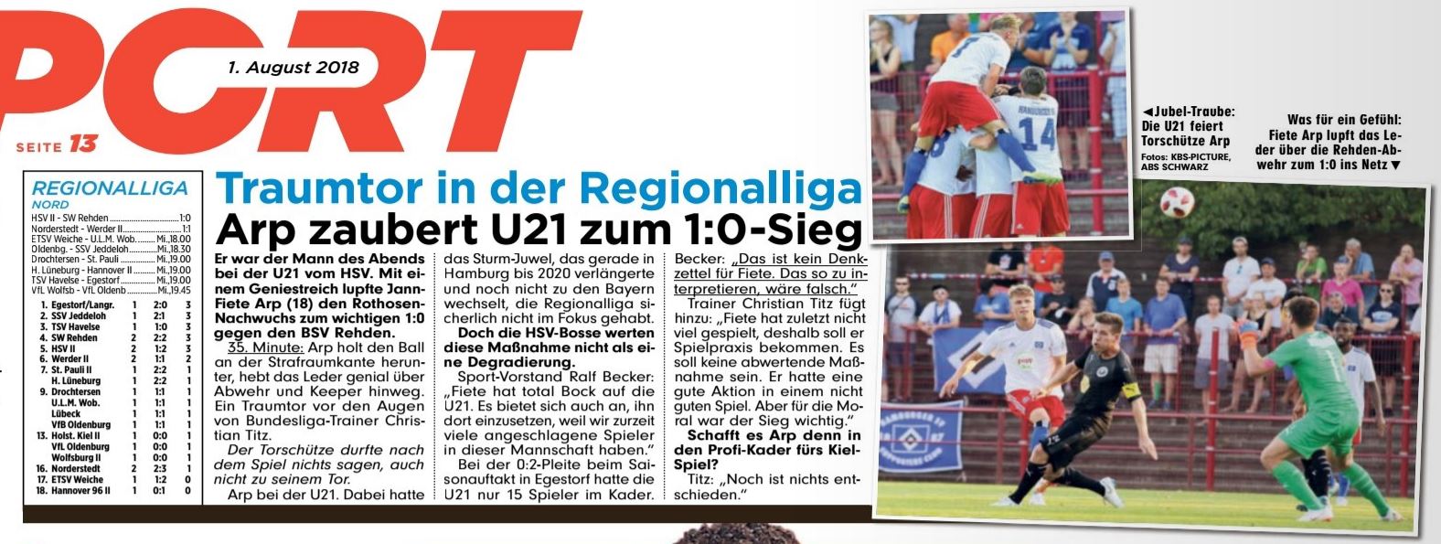 01.08.2018 (Artikel – Print): Traumtor in der Regionalliga – Arp zaubert U21 zum 1:0-Sieg