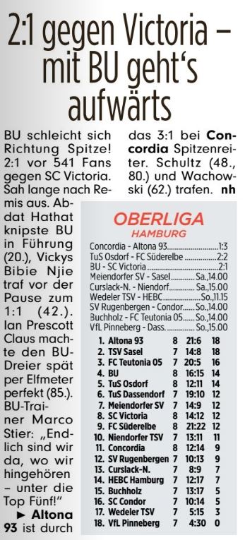 15.09.2018 (Artikel – Print): 2:1 gegen Victoria – mit BU gehts aufwärts
