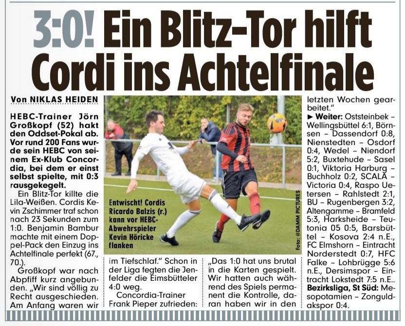 04.10.2018 (Artikel – Print): 3:0! Ein Blitz-Tor hilft Cordi ins Achtelfinale